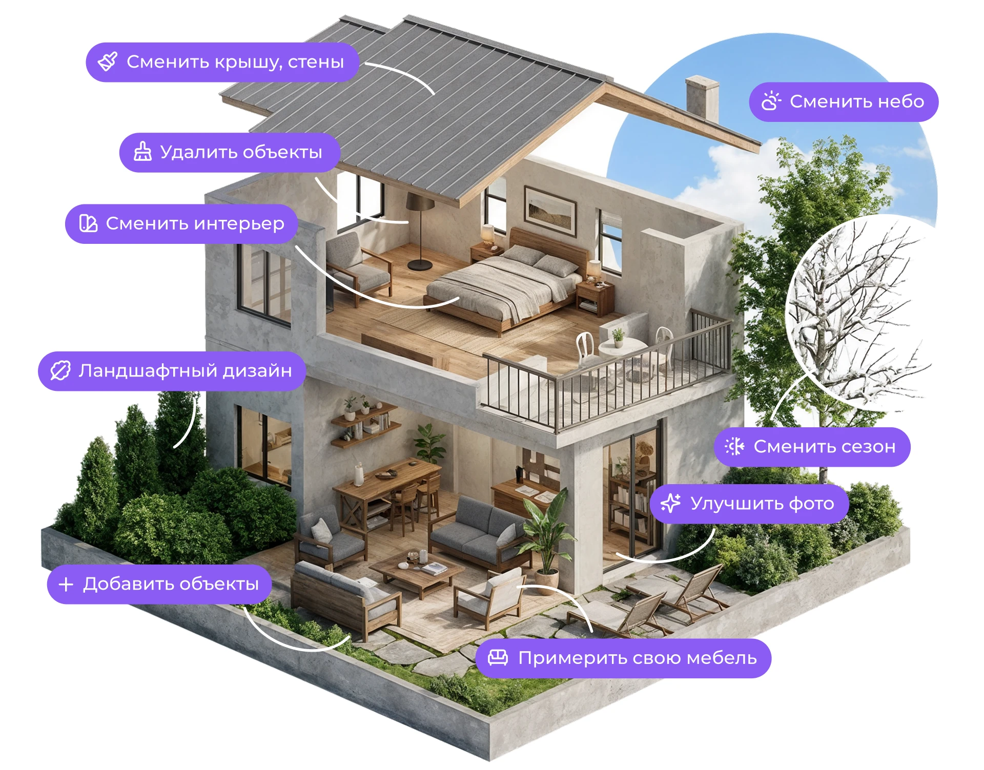 Представите готовый ремонт заранее: примерите мебель, отделку стен и декор всего за пару шагов.
